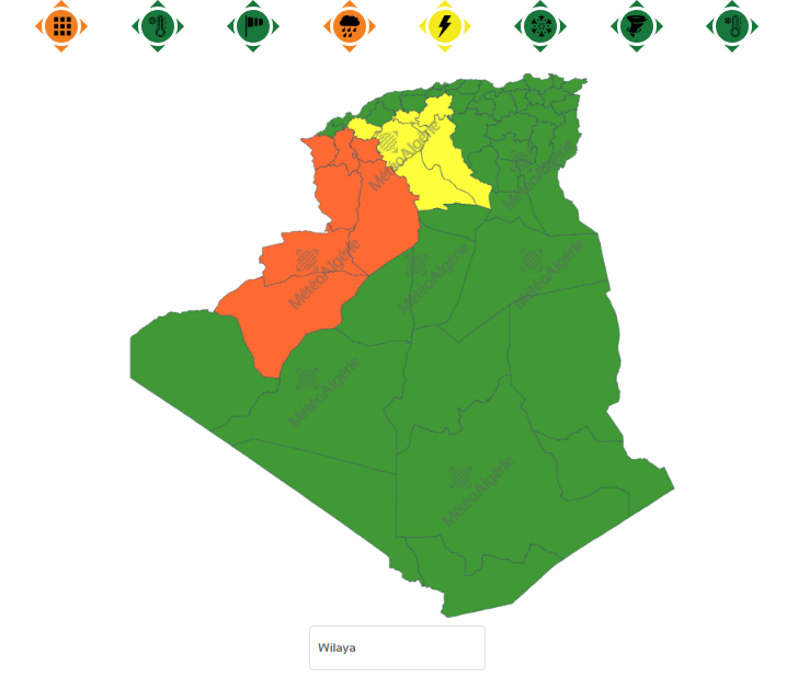 وحسب تنبيه للديوان الوطني للأرصاد الجوية من المستوى الثاني باللون البرتقالي على خريطة اليقظة، فإن الولايات المعنية بنشاط الخلايا الرعدية والأمطار التي تتراوح بين 20 و30 ملم بداية من الثالثة صباحا من اليوم الثلاثاء لغاية الساعة الثانية عشرة صباحا من نفس اليوم هي: شمال بني عباس، بشار، النعامة، البيض، جنوب تلمسان، جنوب سيدي بلعباس وسعيدة.