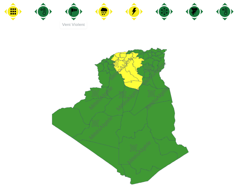 وحسب تنبيه للديوان الوطني للأرصاد الجوية من المستوى الأول باللون الأصفر فإن الولايات المعنية هي: غرداية، الغواط، الجلفة، المسيلة، البويرة، المدية، تيسمسيلت، عين الدفلى، تيارت، غيليزان، تيبازة، الشلف.