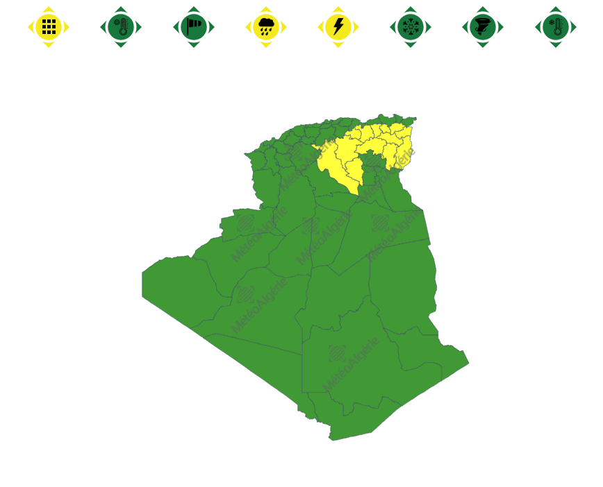 وحسب تنبيه للديوان الوطني للأرصاد الجوية من المستوى الأول باللون الأصفر فإن الولايات المعنية هي: الجلفة، أولاد جلال، المسيلة، باتنة، خنشلة، تبسة، أم البواقي، سوق أهراس، قالمة، قسنطينة، ميلة، سطيف، برج بوعريريج.