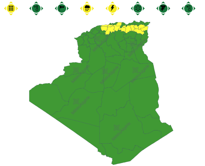 وحسب تنبيه للديوان الوطني للأرصاد الجوية من المستوى الأول باللون الأصفر على خريطة اليقظة، فإن الولايات المعنية بتساقط الأمطار هي: سوق أهراس، تيبازة، برج بوعريريج، ميلة، أم البواقي، قالمة، تيزي وزو، سطيف، قسنطينة، عين الدفلى، المدية، البويرة والبليدة.