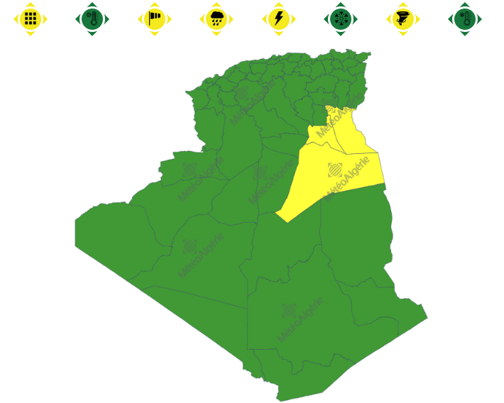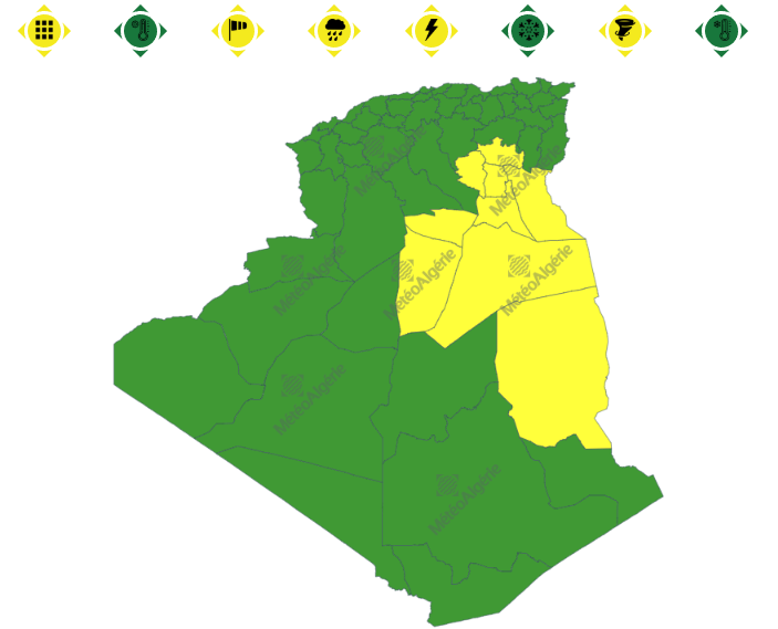 وحسب تنبيه آخر للديوان الوطني للأرصاد الجوية من المستوى الأول باللون الأصفر على خريطة اليقظة، فإن ولايات: ورقلة، الوادي، غرداية، تڤرت، إليزي، المنيعة، المغير، بسكرة وأولاد جلال. ستعرف هبوب رياح عاتية متبوعة بزوابع بداية من الساعة التاسعة صباحا من اليوم السبت لغاية الساعة 12 ليلا من نفس اليوم.