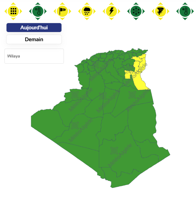 وحسب تنبيه للديوان الوطني للأرصاد الجوية من المستوى الأول باللون الأصفر على خريطة اليقظة، فإن الولايات المعنية بنشاط الخلايا الرعدية والأمطار بداية من الساعة 12 ظُهرا من اليوم الأحد لغاية الساعة السادسة صباحا من يوم غد الإثنين هي: تبسة، سوق أهراس، أم البواقي، خنشلة، الوادي والمغير.