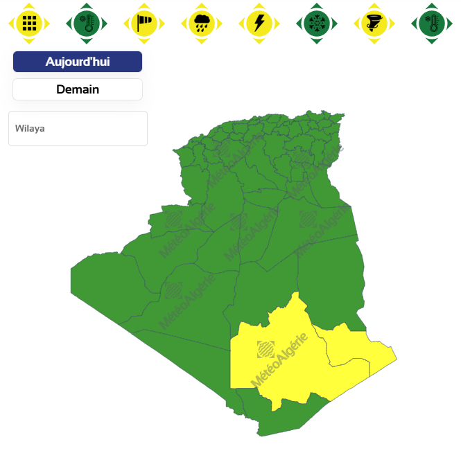 وحسب تنبيه آخر للديوان الوطني للأرصاد الجوية من المستوى الأول باللون الأصفر على خريطة اليقظة، فإن ولايتي: جانت وتمنراست ستعرف هبوب رياح عاتية متبوعة بزوابع رملية بداية من الساعة 12 ظُهرا من اليوم الأحد لغاية الساعة التاسعة مساءً من نفس اليوم.
