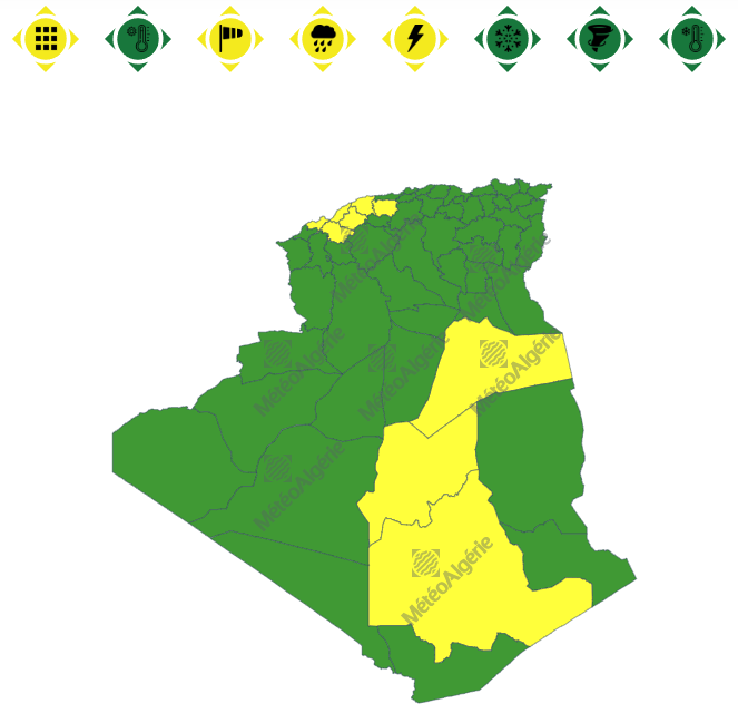 وحسب تنبيه للديوان الوطني للأرصاد الجوية من المستوى الأول باللون الأصفر على خريطة اليقظة، فإن الولايات المعنية بنشاط الخلايا الرعدية والأمطار بداية من الساعة 12 ظُهرا من اليوم الإثنين لغاية الساعة السادسة مساءً من نفس اليوم هي: عين الدفلى، الشلف، مستغانم، غيليزان، معسكر، وهران، ورقلة وعين صالح.