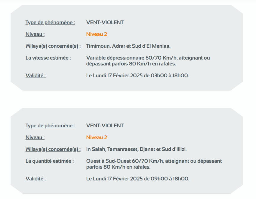 وحسب ذات التنبيه، ستكون الرياح العاتية التي تتراوح سرعتها بين 60 و70 كلم في الساعة وقد تصل أحيانا أو تتجاوز الـ 80 كلم من الساعة الثالثة صباحًا من اليوم الإثنين لغاية الساعة السادسة مساءً على ولايات: تيميمون وأدرار، جنوب المنيعة، عين صالح، تمنراست، جانت وجنوب إليزي.