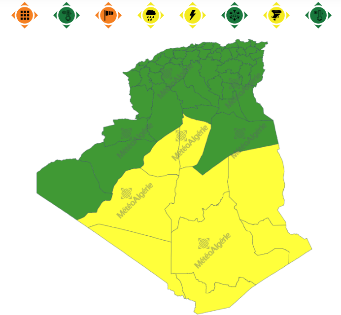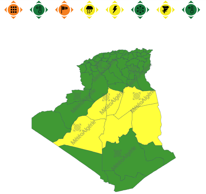 وفي نشرية أخرى، من المستوى الأول باللون الأصفر على خريطة اليقظة، ستجتاح الزوابع الرملية ولايات: المنيعة، تيميمون، أدرار، برج باجي مختار، عين صالح، إيليزي، تمنراست، جانت وعين قزام، من الساعة السادسة صباحا لغاية الساعة التاسعة مساءً.