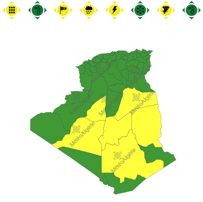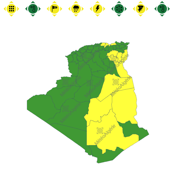 وحسب تنبيه للديوان الوطني للأرصاد الجوية من المستوى الأول باللون الأصفر على خريطة اليقظة، فإن الولايات المعنية بنشاط الخلايا الرعدية والأمطار بداية من السادسة صباحا من اليوم الثلاثاء لغاية الساعة الثالثة صباحًا من يوم غد الأربعاء هي: جيجل، بجاية، تيزي وزو، تبسة، خنشلة، بسكرة، الوادي، باتنة، ورقلة، إيليزي، عين صالح وتمنراست.