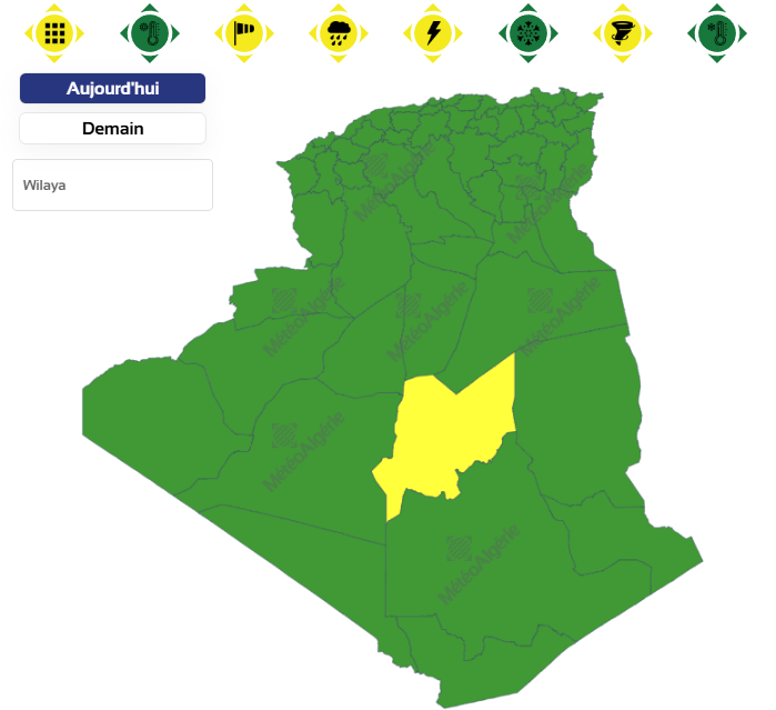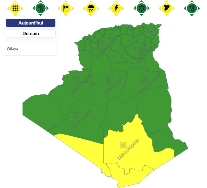 وحسب تنبيه للديوان الوطني للأرصاد الجوية من المستوى الأول باللون الأصفر على خريطة اليقظة، فإن الولايات المعنية بنشاط الخلايا الرعدية والأمطار بداية من الساعة الثالثة بعد الزوال من اليوم الإثنين لغاية الساعة التاسعة من نفس اليوم هي: تمنراست، عين قزام وبرج باجي مختار.