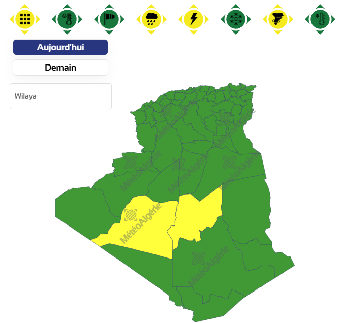 وحسب تنبيه للديوان الوطني للأرصاد الجوية من المستوى الأول باللون الأصفر على خريطة اليقظة، فإن الولايات المعنية بنشاط الخلايا الرعدية والأمطار بداية من الساعة التاسعة صباحا من اليوم الخميس لغاية الساعة السادسة مساءً من نفس اليوم هي: بني عباس وتيندوف.