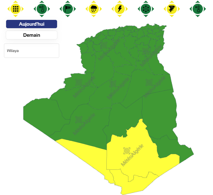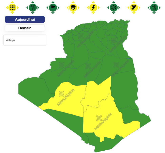 وحسب تنبيه جديد للديوان الوطني للأرصاد الجوية من المستوى الأول باللون الأصفر على خريطة اليقظة، فإن الولايات المعنية بتساقط الأمطار هي: تمنراست، عين صالح وأدرار.