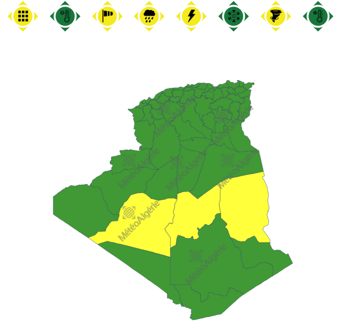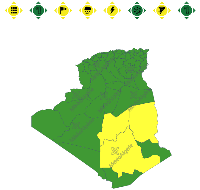 وحسب تنبيه جديد للديوان الوطني للأرصاد الجوية من المستوى الأول باللون الأصفر على خريطة اليقظة، فإن الولايات المعنية بتساقط الأمطار هي: إيليزي، عين صالح وتمنراست.