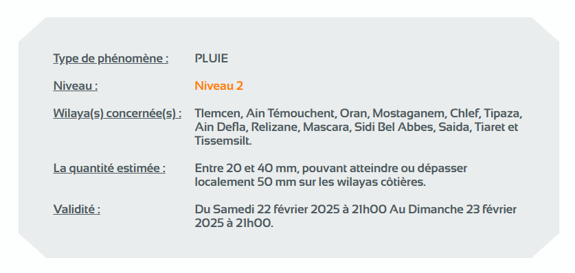 وحسب تنبيه جديد للديوان الوطني للأرصاد الجوية من المستوى الثاني باللون البرتقالي على خريطة اليقظة، فإن الولايات المعنية بتساقط الأمطار التي تتراوح بين 20 و40 ملم وقد تصل أحيانا لـ 50 ملم هي: تلمسان، عين تموشنت، وهران، مستغانم، شلف، تيبازة، عين الدفلى، غيليزان، معسكر، سيدي بلعباس، سعيدة، تيارت وتيسمسيلت.