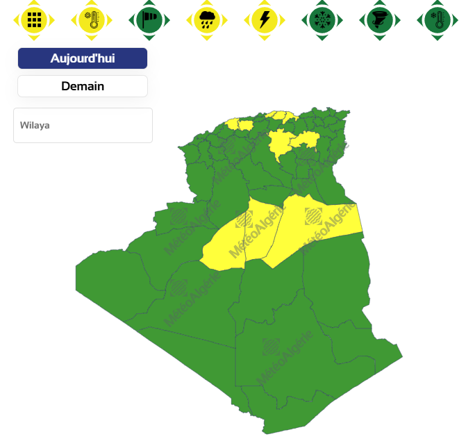 وحسب تنبيه آخر للديوان الوطني للأرصاد الجوية من المستوى الأول باللون الأصفر على خريطة اليقظة، فإن الولايات المعنية بنشاط الخلايا الرعدية والأمطار من الساعة الثالثة زوالا من اليوم الإثنين إلى غاية الساعة 12 ليلا من نفس اليوم هي: سيدي بلعباس، ورقلة، تيسمسيلت، عين قزام، الأغواط، المسيلة، برج باجي مختار، تيارت، تمنراست، أم البواقي، تبسة، الصالح، باتنة، تندوف، سطيف، الجلفة، تلمسان، البيض، خنشلة، عين الدفلى، المدية، أدرار، سعيدة والنعامة.
