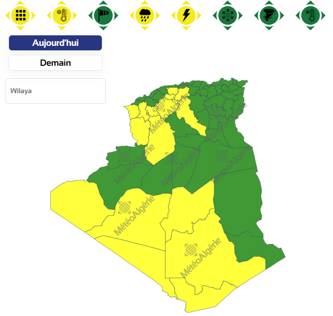 وحسب تنبيه للديوان الوطني للأرصاد الجوية من المستوى الأول باللون الأصفر على خريطة اليقظة، فإن الولايات المعنية بموجة الحر من الساعة التاسعة صباحا من اليوم الإثنين إلى غاية الساعة السادسة صباحا من يوم غد الثلاثاء هي: بجاية، تيزي وزو، بومرداس، عين الدفلى، الشلف، ورقلة، المنيعة وتيميمون.