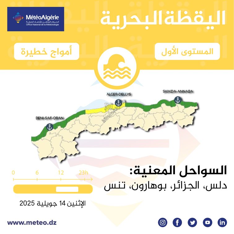 وحسب تنبيه للديوان الوطني للأرصاد الجوية من المستوى الأول باللون الأصفر على خريطة اليقظة، فإن السواحل المعنية بالأمواج الخطيرة هي: دلس، الجزائر، بوهارون وتنس.