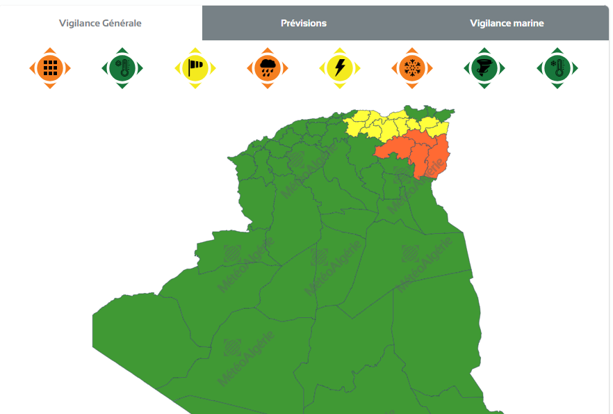 وحسب تنبيه للديوان الوطني للأرصاد الجوية من المستوى الثاني باللون البرتقالي على خريطة اليقظة، فإن الولايات المعنية بتساقط الأمطار هي: بجاية، جيجل، سكيكدة، عنابة، الطارف، شمال سطيف، ميلة، قسنطينة، قالمة وسوق أهراس.