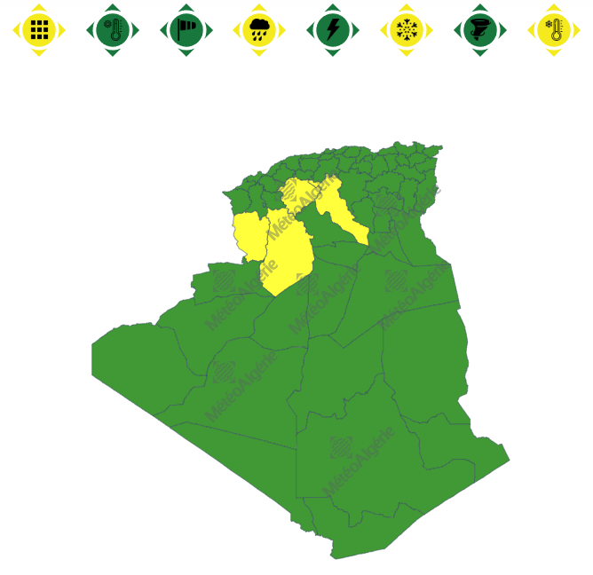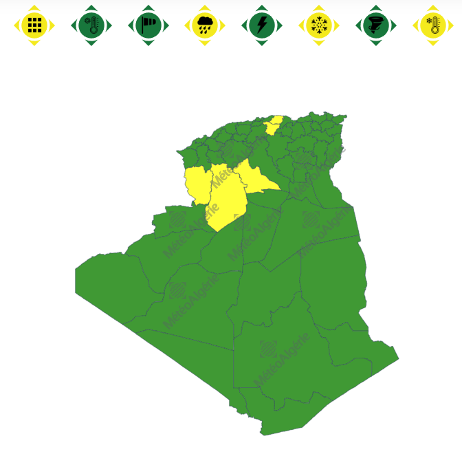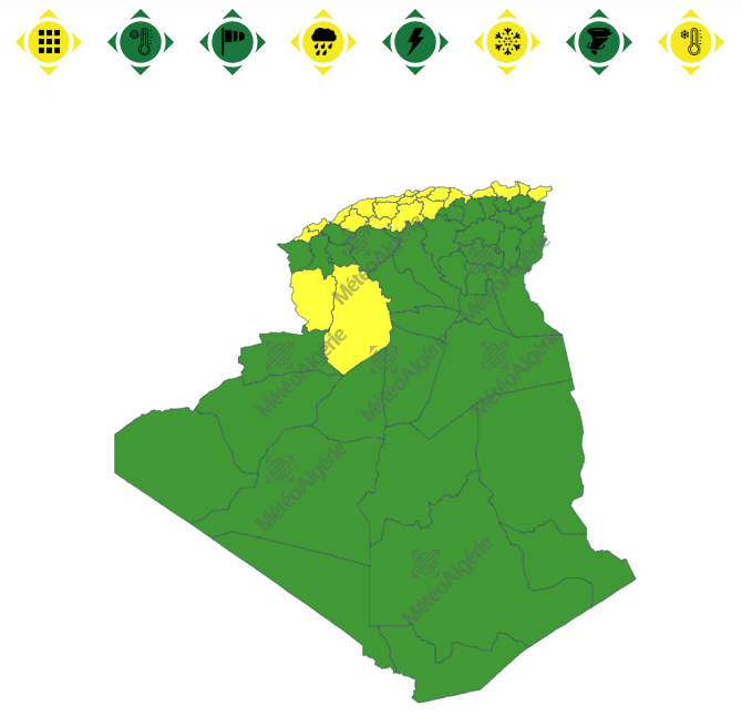 وحسب تنبيه آخر من المستوى الأول باللون الأصفر على خريطة اليقظة فإن الولايات المعنية بتساقط الأمطار هي: عين تموشنت، وهران، مستغانم، غيليزان، الشلف، عين الدفلى، تيبازة، تيسمسيلت، الجزائر العاصمة، البليدة، المدية، البويرة، تيزي وزو، بومرداس، بجاية، جيجل، سكيكدة، عنابة، الطارف، البيض والنعامة.