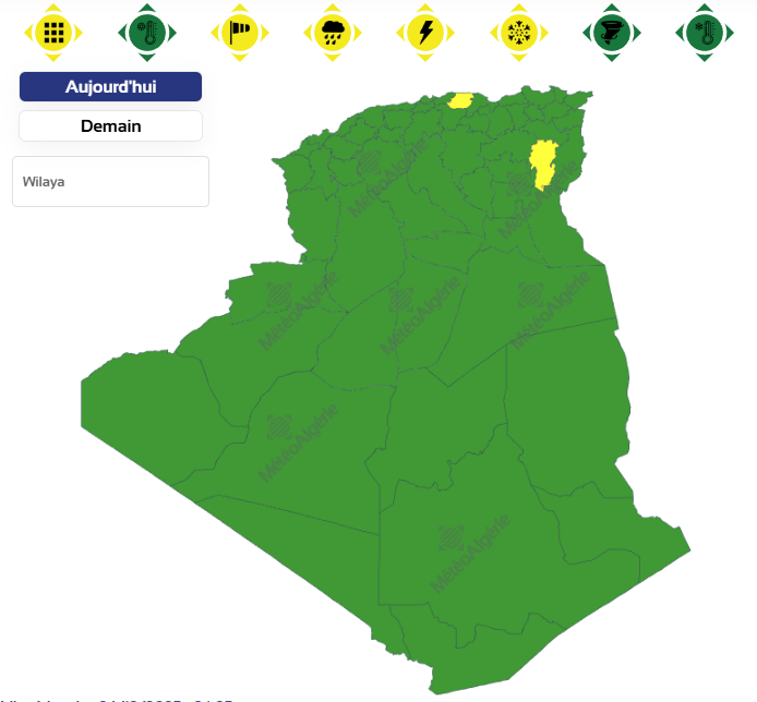 كما نبه الديوان في نشرية أخرى من المستوى الثاني باللون البرتقالي على خريطة اليقظة، بتساقط أمطار متبوعة برياح من الساعة السادسة مساءً من اليوم الخميس إلى غاية الساعة السادسة صباحا من يوم غد الجمعة على ولايات: الجزائر، سوق أهراس، تيبازة، تيسمسيلت، الأغواط، برج بوعريرج، بجاية، المسيلة، ميلة، تبسة، قالمة، تيزي وزو، الشلف، مستغانم، عنابة، سطيف، عين تموشنت، الجلفة، قسنطينة، سكيكدة، جيجل، خنشلة، عين الدفلى، المدية، الطارف، بومرداس، البويرة، أولاد جلال، وهران والبليدة.
