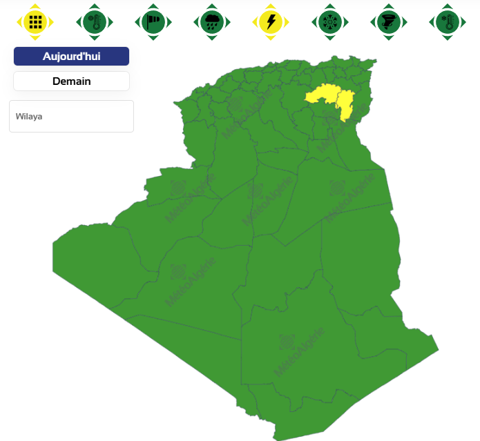 وحسب تنبيه للديوان الوطني للأرصاد الجوية من المستوى الأول باللون الأصفر على خريطة اليقظة، فإن الولايات المعنية بنشاط الخلايا الرعدية بداية من الساعة الثالثة بعد الزوال من اليوم السبت لغاية الساعة التاسعة مساءً من نفس اليوم هي: خنشلة وباتنة.