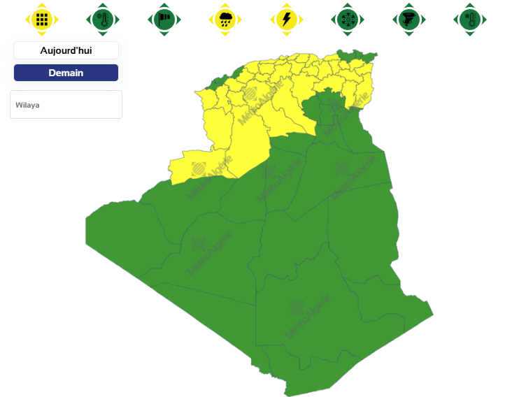 وحسب تنبيه للديوان الوطني للأرصاد الجوية من المستوى الأول باللون الأصفر على خريطة اليقظة، فإن الولايات المعنية بتساقط الأمطار الرعدية من الساعة الثالثة بعد الزوال من يوم غد الأحد إلى غاية الساعة السادسة صباحا من يوم الإثنين هي: الجزائر العاصمة، سيدي بلعباس، سوق أهراس، تيبازة، تيسمسيلت، الأغواط، برج بوعريريج، غليزان، بجاية، المسيلة، تيارت، ميلة، أم البواقي، تبسة، قالمة، تيزي وزو، الشلف، باتنة، سطيف، الجلفة، تلمسان، قسنطينة، البيض، جيجل، خنشلة، عين الدفلى، المدية، سعيدة، النعامة، بومرداس، البويرة، معسكر، البليدة وبشار.