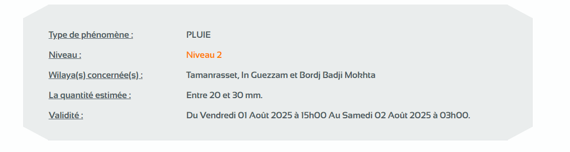 وأفادت النشرية التي حملت إنذارا من المستوى الثاني أن الأمطار الغزيرة جدا ستخص ولايات: تمنراست، إن قزام وبرج باجي مختار.