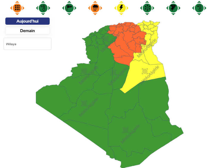 وحسب تنبيه للديوان الوطني للأرصاد الجوية من المستوى الثاني باللون البرتقالي على خريطة اليقظة، فإن الولايات المعنية بنشاط الخلايا الرعدية والأمطار التي تتراوح بين 20 و40 ملم وقد تصل أو تتجاوز أحيانا الـ 50 ملم محليا بداية من السادسة صباحا من اليوم الإثنين لغاية الساعة التاسعة من نفس اليوم هي: الجزائر العاصمة، سيدي بلعباس، ورقلة، تيبازة، تيسمسيلت، الأغواط، برج بو عريرج، غليزان، بجاية، غرداية، تقرت، المسيلة، تيارت، تيزي وزو، الشلف، مستغانم، عين تموشنت، الجلفة، تلمسان، البيض، عين الدفلى، المدية، سعيدة، النعامة، بومرداس، البويرة، معسكر، وهران، البليدة