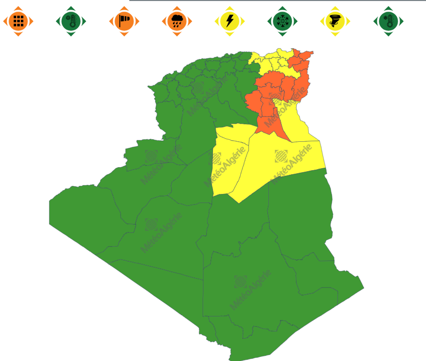 كما حملت النشرية تنبيها باللون الأصفر يتعلق بتساقط أمطار ورياح قوية على سكيكدة، قسنطينة، ميلة، جيجل، سطيف وبجاية.