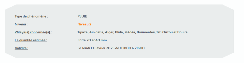 وحسب تنبيه جديد للديوان الوطني للأرصاد الجوية من المستوى الثاني باللون البرتقالي على خريطة اليقظة، فإن الولايات المعنية بتساقط الأمطار التي تتراوح بين 20 و40 ملم هي: تيبازة، عين الدفلى، الجزائر العاصمة، البليدة، المدية، بومرداس، تيزي وزو والبويرة.