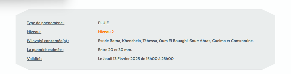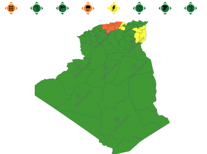 وحسب تنبيه آخر للديوان الوطني للأرصاد الجوية من المستوى الأول باللون الأصفر على خريطة اليقظة، فإن ولايات: بجاية، برج بوعريريج، سوق أهراس، أم البواقي، خنشلة وتبسة، ستعرف تساقط لأمطار رعدية معتبرة بداية من الساعة 12:00 صباحا من اليوم الخميس إلى غاية الساعة التاسعة مساءً من نفس اليوم.