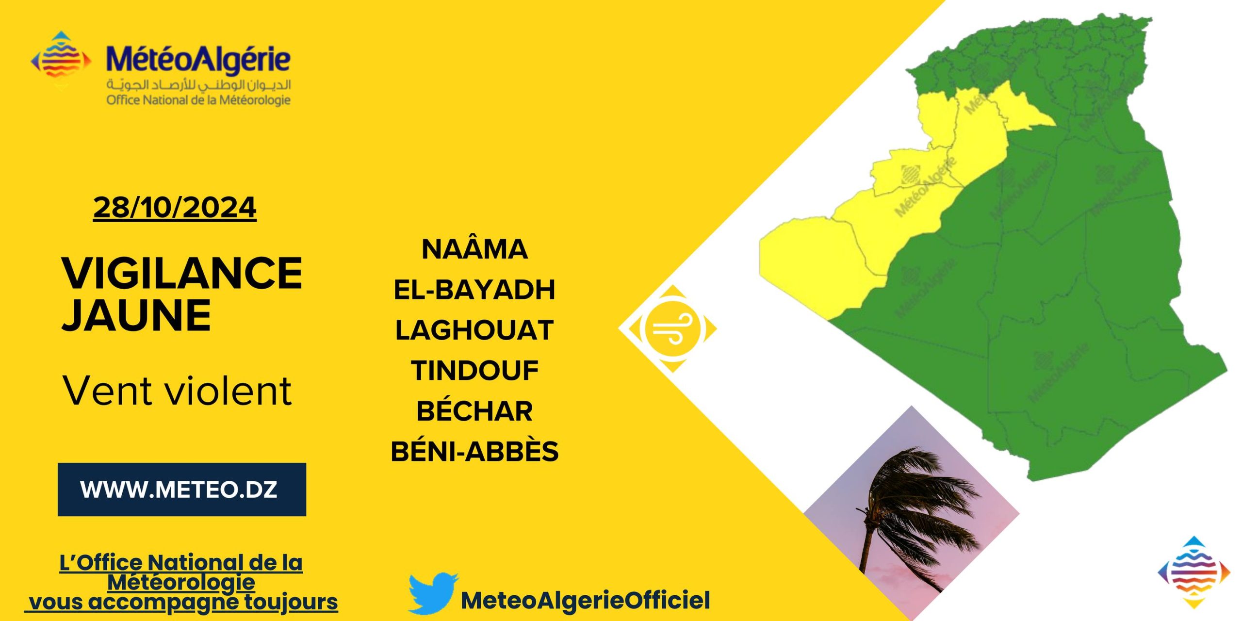 وحسب تنبيه للديوان الوطني للأرصاد الجوية من المستوى الأول باللون الأصفر، فإن الولايات المعنية بالرياح العاتية: الأغواط، البيض، النعامة، بشار، بني عباس وتندوف.