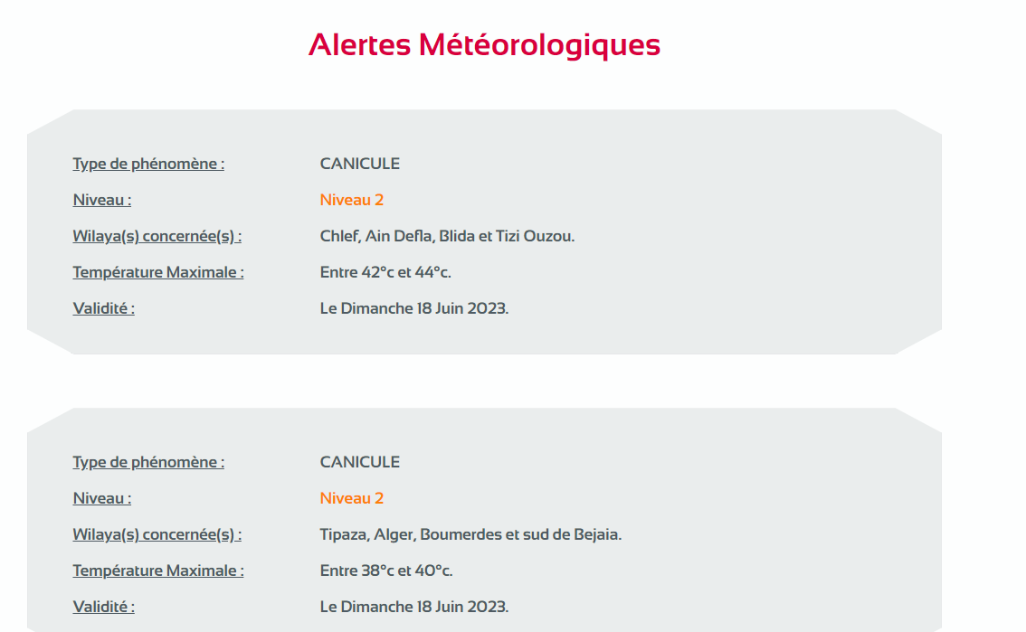 وأفادت النشرية التي حملت تنبيها من المستوى الثاني أن موجة الحر ستخص ولايات: الجزائر العاصمة، تيبازة، بجاية وبومرداس وستتراوح درجات الحرارة ما بين 38 إلى 40 درجة مئوية.