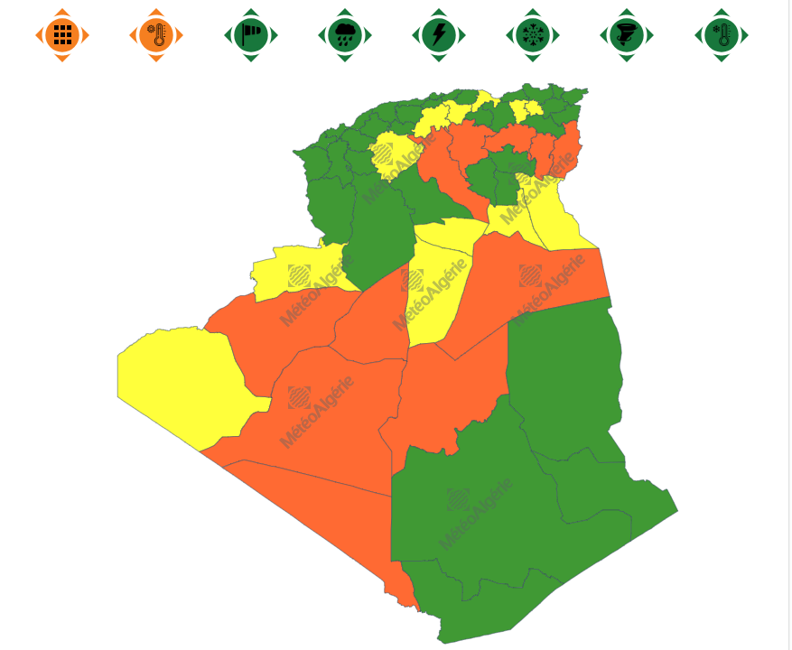 كما حملت النشرية تنبيها من المستوى الأول حل ارتفاع درجات الحرارة في ولايات: قسنطينة، ميلة، بجاية، البويرة، المدية، الوادي، تقرت، غرداية، المنيعة، بشاروتيندوف.
