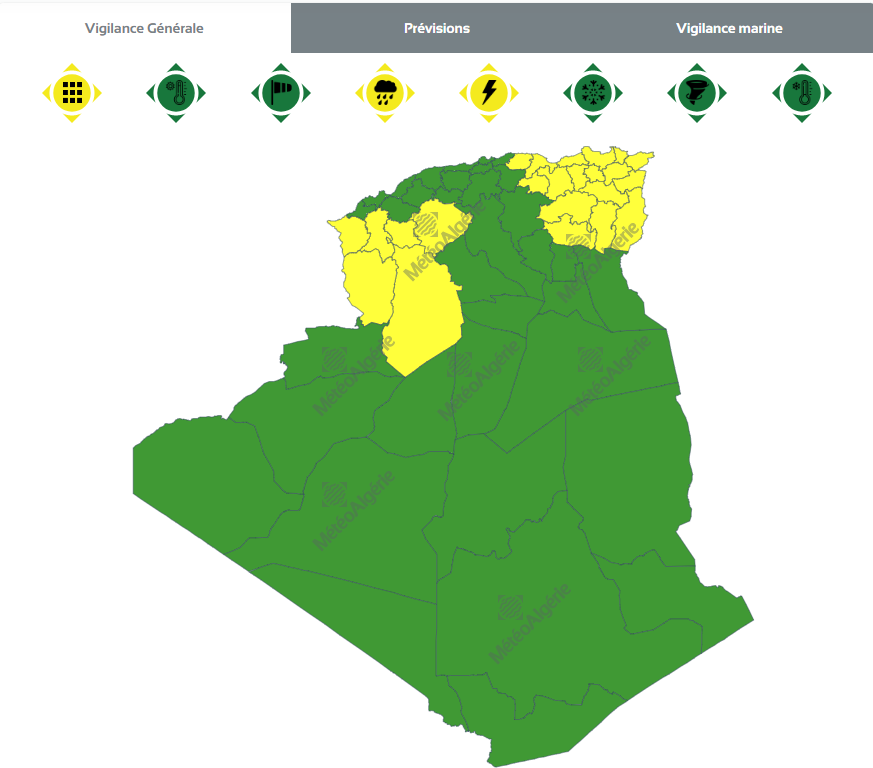 وحسب تنبيه من المستوى الأول، أفادت نشرية جديدة بتساقط أمطار رعدية عبر عدة ولايات تستمر إلى غاية 6 مساء عبر بعض الولايات وإلى صبيحة الجمعة عبر أخرى.