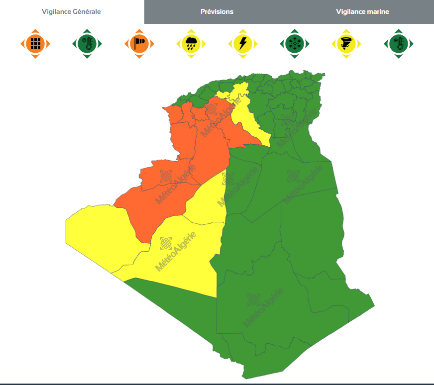 وحسب تنبيه من المستوى الأول لديوان الأرصاد الجوية فإن الولايات المعنية بتساقط الأمطار هي: تيازة، الجزائر، البليدة، بومرداس، المدية، عين الدفلى، الشلف، تيسمسيلت، غليزان، مستغانم، معسكر، وهران، عين تيموشنت، تلمسان، سيدي بلعباس، سعيدة، تيارت، النعامة، البيض، بشار، بني عباس وتندوف.