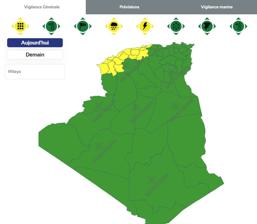 وحسب تنبيه من المستوى الأول جاء باللون الأصفر فإن الولايات المعنية هي: بومرداس، الجزائر، تيبازة، الشلف، مستغانم، وهران، عين تموشنت، تلمسان، سيدي بلعياس، سعيدة، معسكر، غليزان، تيسمسيلت، عين الدفلى، المدية، البليدة.