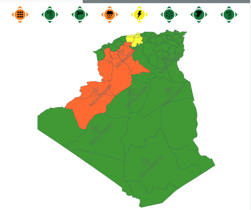 وأفادت النشرية التي حملت اللون البرتقالي أن الولايات المعنية هي: الجزائر العاصمة، المدية، البليدة، تيبازة، عين الدفلى، تيسمسيلت، تيارت، سعيدة، سيدي بعلباس، البيض، الأغواط، النعامة، بشار وبني عباس.