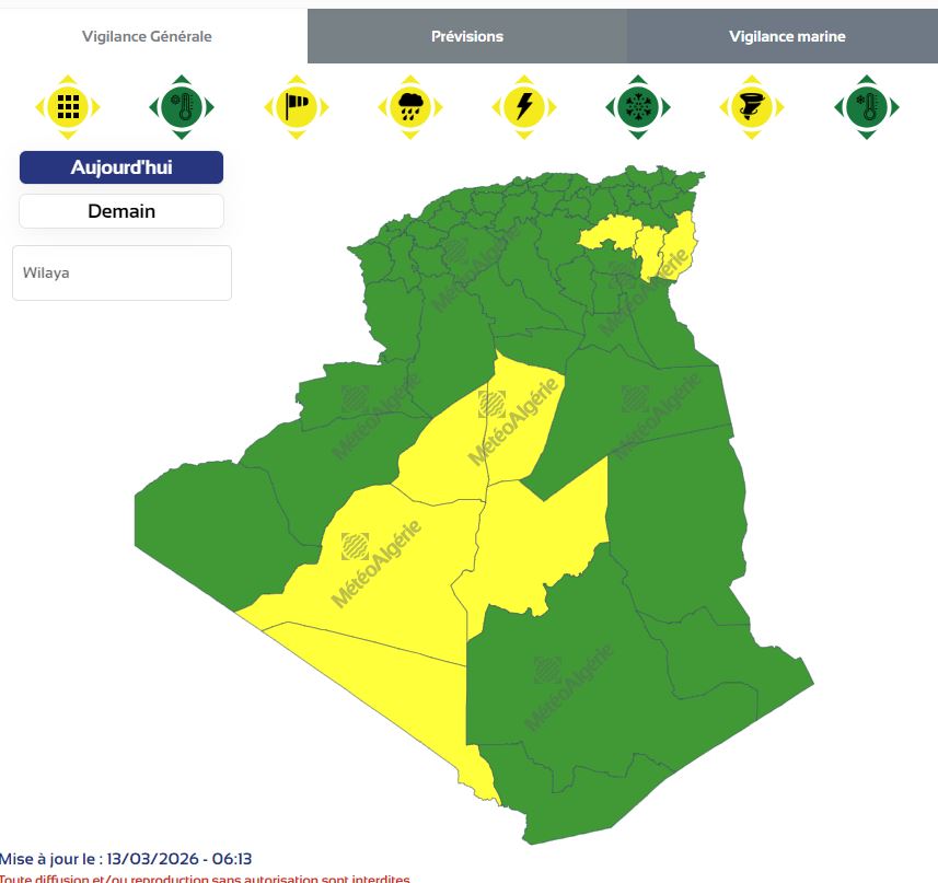 نبه الديوان الوطني للأرصاد الجوية، في نشرية حول حالة الطقس ليوم الجمعة من تساقط أمطار رعدية وكذا هبوب رياح مرفوقة بزوابع رملية عبر عدد من الولايات.