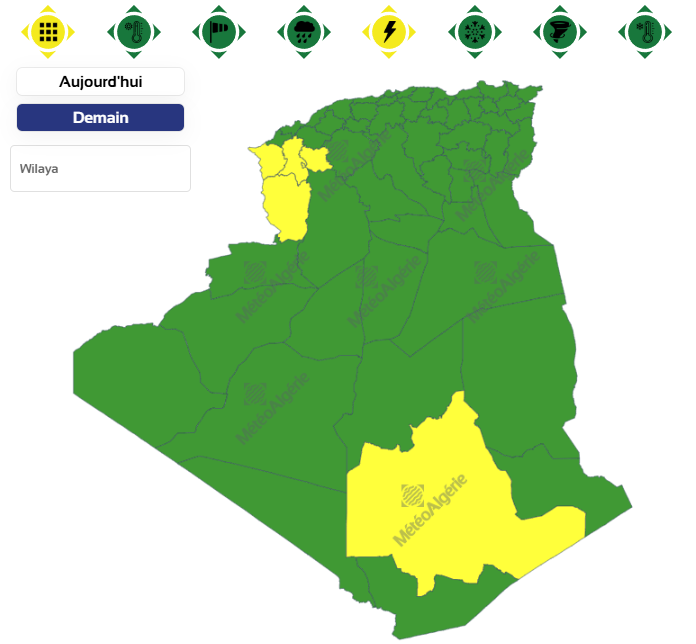 وحسب تنبيه للديوان الوطني للأرصاد الجوية من المستوى الأول باللون الأصفر على خريطة اليقظة، فإن الولايات المعنية بنشاط الخلايا الرعدية بداية من الساعة الثالثة بعد الزوال من اليوم الثلاثاء لغاية الساعة السادسة صباحا من يوم غد الأربعاء هي: سيدي بلعباس، برج باجي مختار، تمنراست، تلمسان، سعيدة والنعامة.