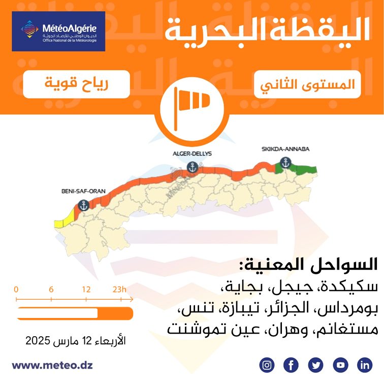 وحسب تنبيه للديوان الوطني للأرصاد الجوية من المستوى الثاني باللون البرتقالي على خريطة اليقظة، فإن السواحل المعنية بالرياح العاتية هي: سكيكدة، جيجل، بجاية، بومرداس، الجزائر العاصمة، تيبازة، تنس، مستغانم، وهران وعين تموشنت.