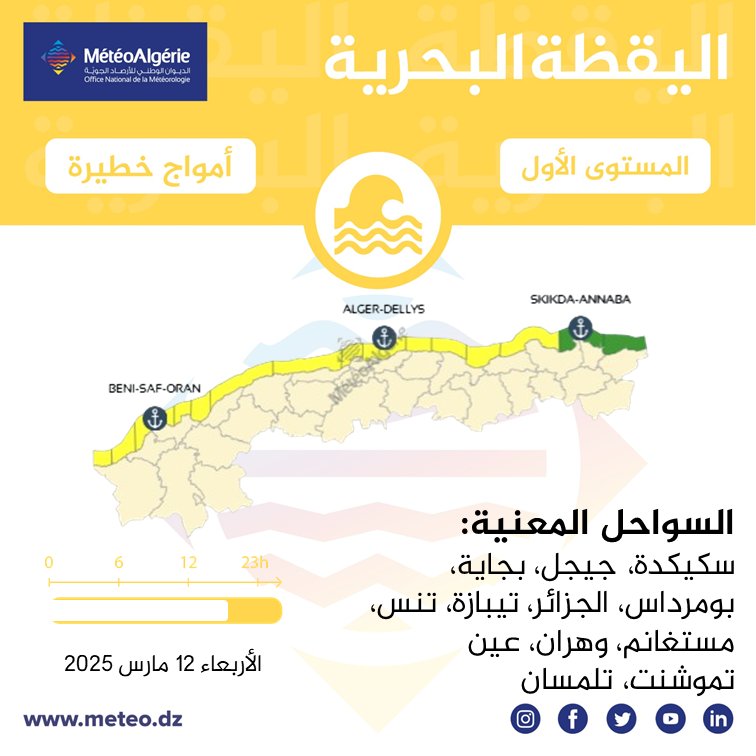 وحسب تنبيه آخر من المستوى الأول باللون الأصفر على خريطة اليقظة فإن السواحل المعنية بالأمواج الخطيرة هي: سكيكدة، جيجل، بجاية، بومرداس، الجزائر العاصمة، تيبازة، تنس، مستغانم، وهران، عين تموشنت وتلمسان.