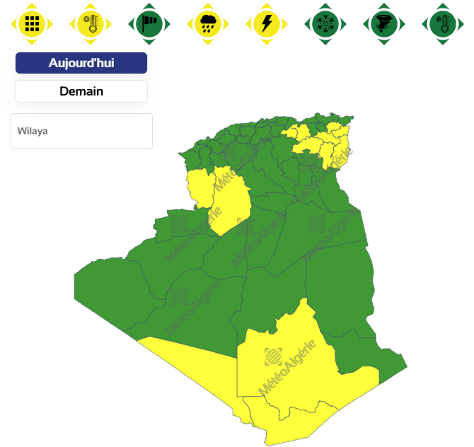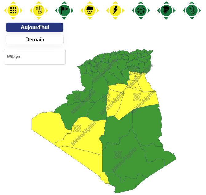 وحسب تنبيه آخر للديوان الوطني للأرصاد الجوية من المستوى الأول باللون الأصفر على خريطة اليقظة، فإن الولايات المعنية بنشاط الخلايا الرعدية والأمطار من الساعة 12 زوالا إلى غاية الساعة 12 ليلا من اليوم الثلاثاء هي: سوق أهراس، ورقلة، الوادي، تيميمون، عين قزام، الأغواط، برج بو عريريج، غرداية، تقرت، المسيلة، برج باجي مختار، تمنراست، أم البواقي، تبسة، قالمة، عين صالح، باتنة، تندوف، سطيف، الجلفة، إليزي، المنيعة، البيض، المغير، خنشلة، أدرار، النعامة وبشار.