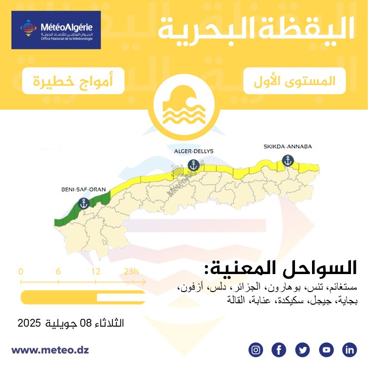 وحسب تنبيه آخر من المستوى الأول باللون الأصفر على خريطة اليقظة فإن السواحل المعنية بالأمواج الخطيرة هي: مستغانم، تنس، بوهارون، الجزائر العاصمة، دلس، أزفون، بجاية، جيجل، سكيكدة، عنابة، القالة.