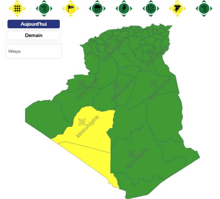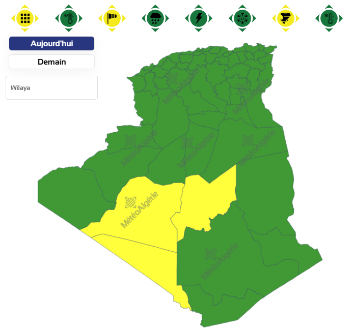 وحسب تنبيه للديوان الوطني للأرصاد الجوية من المستوى الأول باللون الأصفر على خريطة اليقظة، فإن الولاية المعنية بهبوب الرياح العاتية بداية من الساعة 12 زوالا من اليوم السبت لغاية الساعة السادسة مساءً من نفس اليوم هما ولايتي أدرار وبرج باجي مختار.