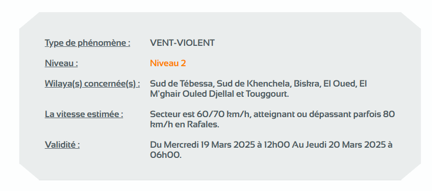 وحسب تنبيه للديوان الوطني للأرصاد الجوية من المستوى الثاني باللون البرتقالي على خريطة اليقظة، فإن الولايات المعنية بهبوب الرياح العاتية التي تتراوح بين 60 و70 كلم وقد تصل أحيانا أو تتجاوز الـ 80 كلم بداية من الساعة 12 ظُهرا من اليوم الأربعاء لغاية الساعة السادسة صباحا من يوم الخميس هي: جنوب تبسة، جنوب خنشلة، بسكرة، الوادي، المغير أولاد جلال وتڤرت.
