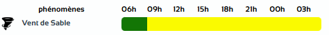 وفي نشرية أخرى، من المستوى الأول باللون الأصفر على خريطة اليقظة، ستجتاح الزوابع الرملية ولايات: المسيلة، الجلفة، الأغواط، تبسة، خنشلة، بسكرة، أولاد جلال، الوادي، المغير، توڤرت غرداية وورڤلة من الساعة التاسعة صباحا من اليوم الأربعاء لغاية الساعة الثالثة صباحا من يوم الخميس.