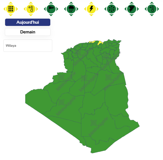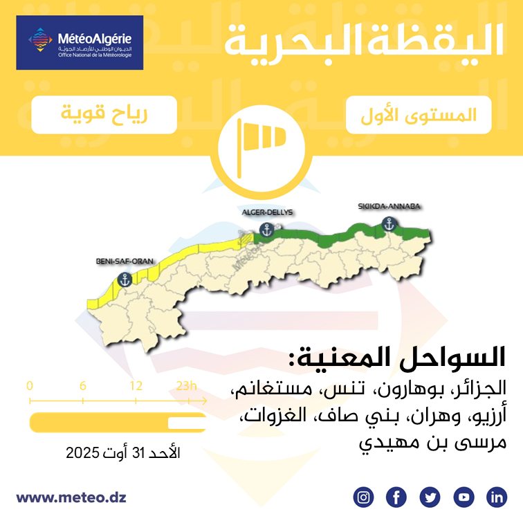 وحسب تنبيه للديوان الوطني للأرصاد الجوية من المستوى الأول باللون الأصفر على خريطة اليقظة، فإن السواحل المعنية بالرياح العاتية هي: الجزائر العاصمة، بوهارون، تنس، مستغانم، أرزيو، وهران، بني صاف، الغزوات، ومرسى بن مهيدي.