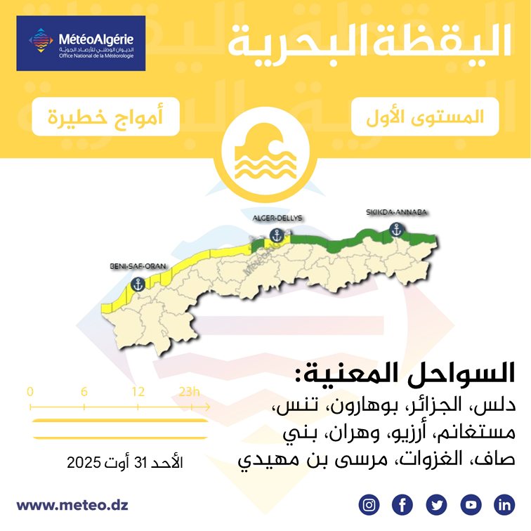 وحسب تنبيه آخر من المستوى الأول باللون الأصفر على خريطة اليقظة فإن السواحل المعنية بالأمواج الخطيرة هي: دلس، الجزائر العاصمة، بوهارون، تنس، مستغانم، أرزيو، وهران، بني صاف، الغزوات، ومرسى بن مهيدي.