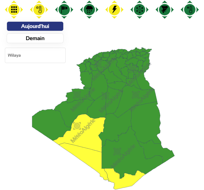 وحسب تنبيه آخر، من المستوى الأول باللون الأصفر على خريطة اليقظة، فإن الولايات المعنية بالرعود بداية من الساعة الثالثة بعد الزوال من اليوم الأحد لغاية الساعة التاسعة مساءً من نفس اليوم هي: أدرار، عين قزام وبرج باجي مختار.
