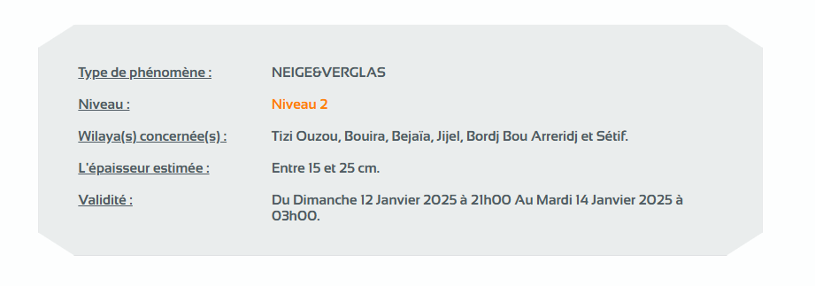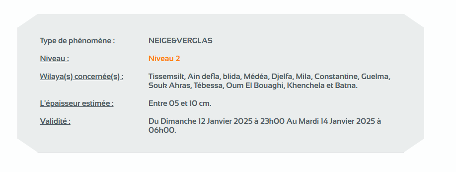 وحسب تنبيه للديوان الوطني للأرصاد الجوية من المستوى الثاني باللون البرتقالي على خريطة اليقظة، ستتساقط الثلوج التي يتراوح سمكها بين 05 و10 سم من الساعة السادسة 11:00 ليلا من يوم الأحد لغاية الساعة السادسة صباحا من يوم الثلاثاء على ولايات: تيسمسيلت، عين الدفلى، البليدة، المدية، الجلفة، ميلة، قسنطينة، قالمة، سوق أهراس، تبسة، أم البواقي، خنشلة وباتنة.