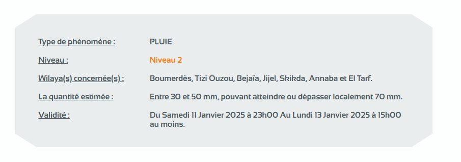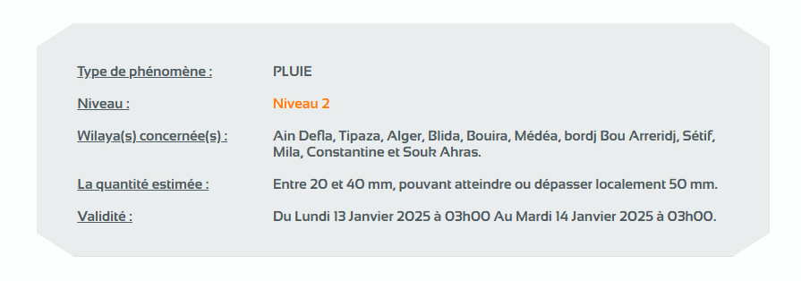 ونبه الديوان الوطني، في نشرية أخرى له من المستوى الثاني على خريطة اليقظة من تساقط أمطار تتراوح بين 20 و40 ملم على ولايات: عين الدفلى، تيبازة، الجزائر العاصمة، البليدة، البويرة، المدية، برج بوعريريج، سطيف، ميلة، قسنطينة وسوق أهراس بدايةً من الساعة الثالثة صباحا من يوم الإثنين لغاية الساعة الثالثة صباحا من يوم الثلاثاء.